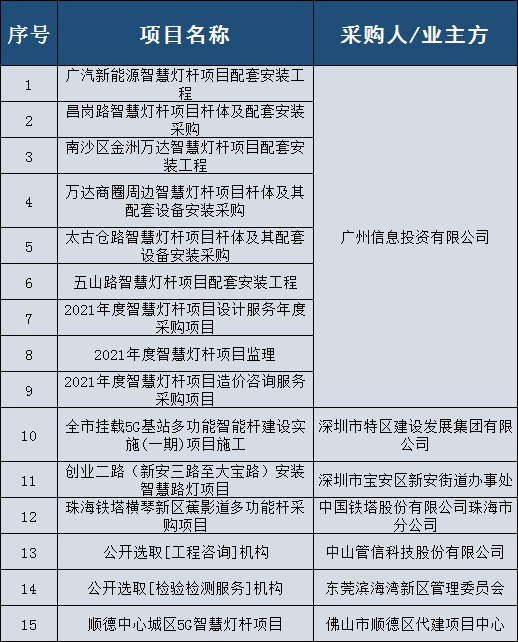 经小编统计,广东省2021年智慧灯杆招标总金额高达4.5亿!6个省市总发布了15个项目。6个省市分别有广州市、深圳市、珠海市、中山市、东莞市、佛山市。
